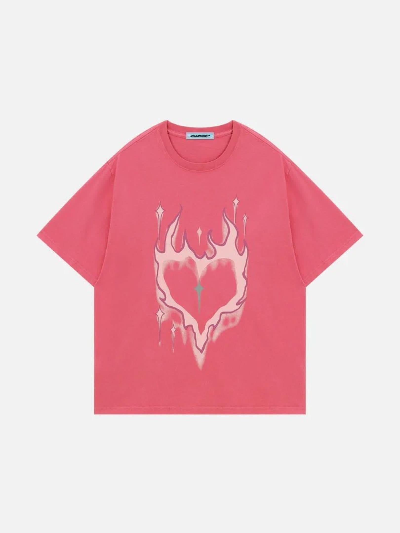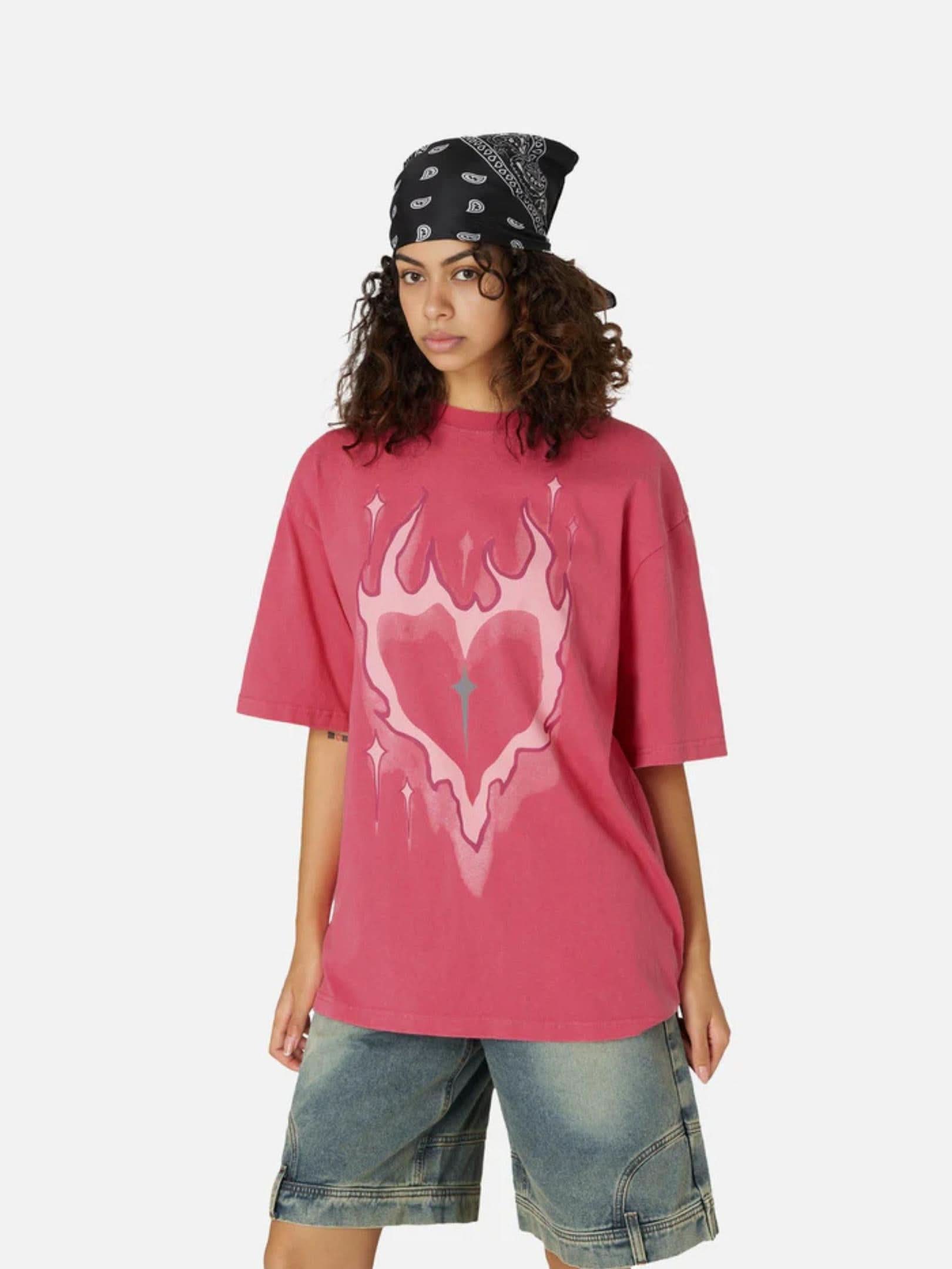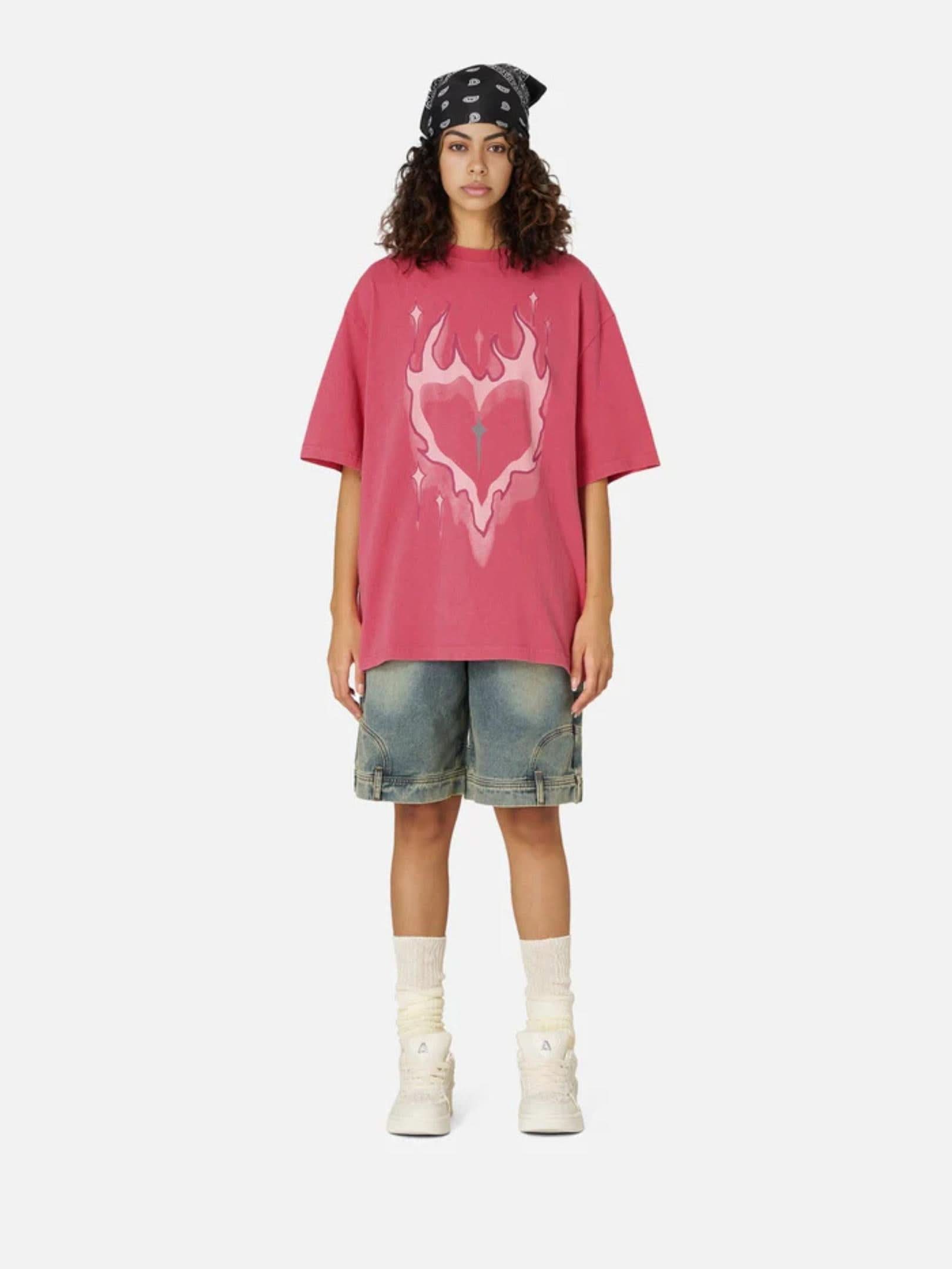 The "Heat-Seeker" Heavyweight Fabric Constructed from our premium 320GSM Open-End Cotton, the Heart-Flame Tee offers that authentic, "crisp" streetwear feel. This fabric is specifically chosen for its ability to hold the integrity of high-density prints while maintaining a rigid, boxy silhouette. It’s thick, durable, and designed to look better with every mile of concrete you cover.